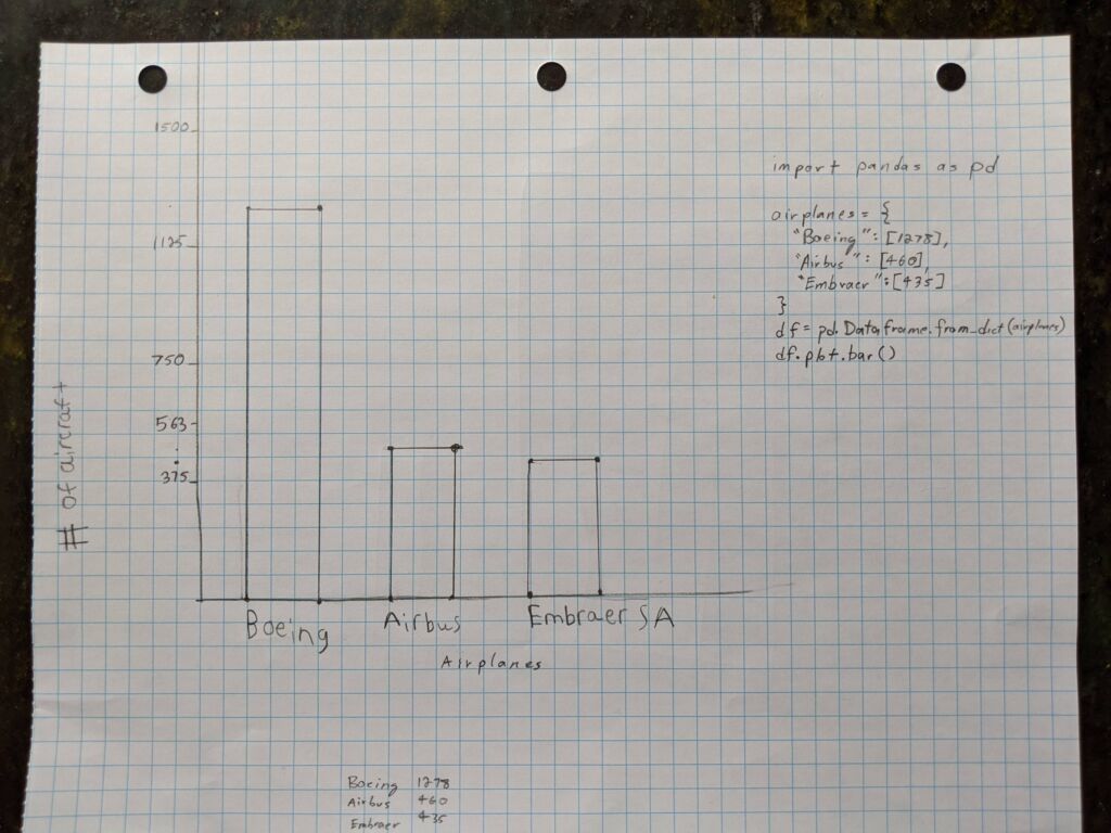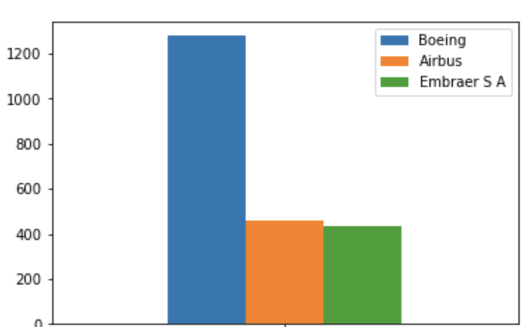 Attached is a simple bar graph of counts of three aircraft manufacturers that flew over our area in the past week. The data is from our recording of flights in the area to a database. My dad helped me get the data from the database, and I used the data to build the graph. My dad also added the Python code to generate a bar graph as well: